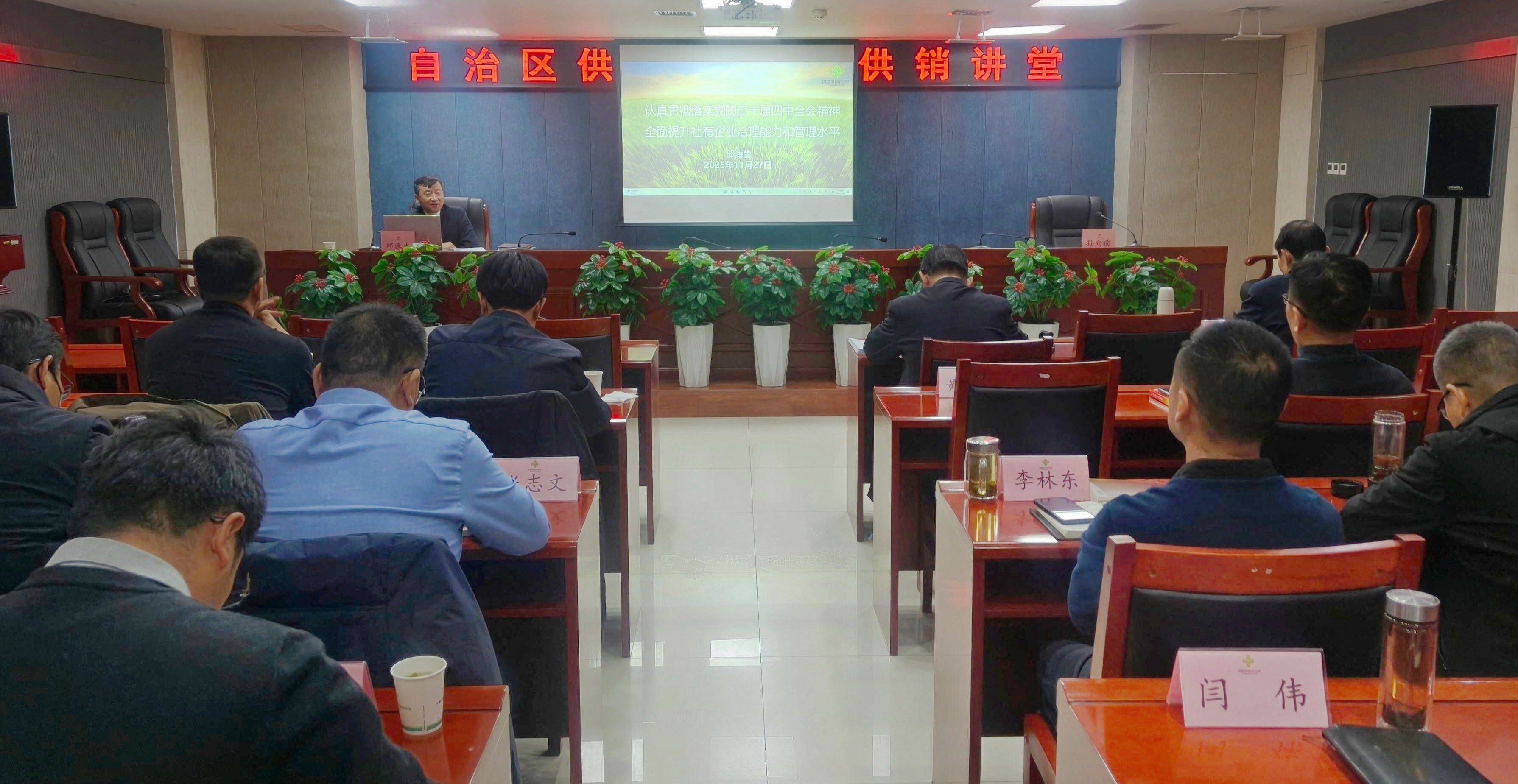 为进一步提升供销合作社直属系统党员干部职工素质能力,强化人才队伍建设,11月28日,自治区供销合作社举办第十一期“供销讲堂”,宁夏供销集团党委副书记、总经理邱海生同志围绕“认真贯彻落实党的二十届四中全会精神 全面提升社有企业治理能力和管理水平”主题作导学解读。区社领导班子成员、机关全体干部职工,直属社有企业班子成员及中层正职60余人参加。